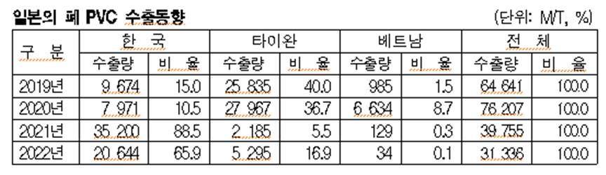 일본산 폐 PVC(Polyvinyl Chloride) 수입이 급증하고 있다. 표, 그래프: <일본의 폐 PVC 수출동향> <화학저널 2023/05/16> |
