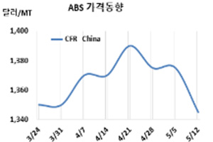 ABS(Acrylonitrile Butadiene Styrene)는 급락으로 전환했다. ABS 시세는 5월10일 CFR China가 톤당 1345달러로 30달러 급락했고 CFR SE Asia는 1370달러로 40달러 폭락했다. CFR S Asia는 1410달러로 30달러 급락했다. 표, 그래프: <ABS 가격동향> <화학저널 2023/05/17> |