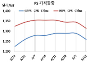 PS(Polystyrene)는 급락세로 전환했다. GPPS(General Purpose PS) 시세는 5월10일 CFR China가 1260달러, CFR SE Asia는 1245달러로 각각 30달러 급락했다. CFR India는 1275달러로 20달러 떨어졌다. 표, 그래프: <PS 가격동향> <화학저널 2023/05/17> |