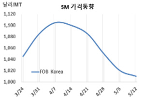SM(Styrene Monomer)은 하락세가 둔화했다. SM 시세는 5월12일 FOB Korea가 톤당 1010달러로 10달러, CFR SE Asia는 1015달러로 20달러 하락했다. CFR China와 CFR Taiwan는 1010달러로 10달러 떨어졌다. CFR India는 1015달러로 20달러 하락했다. 표, 그래프: <SM 가격동향> <화학저널 2023/05/17> |