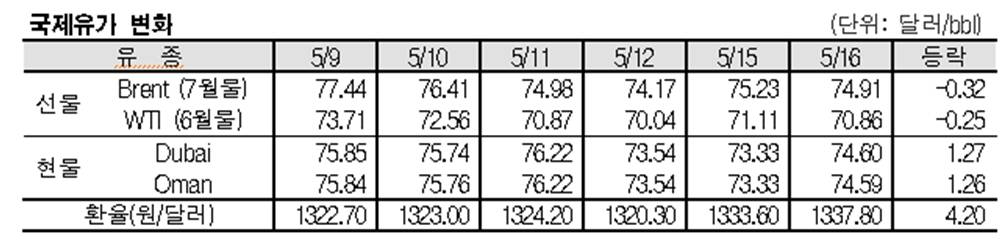 5월16일 국제유가는 중국 경제 지표 부진과 미국 디폴트 우려로 하락했다.