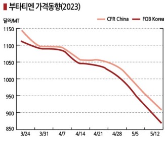 중국의 신규 부타디엔 플랜트 가동이 잇따르면서 공급이 늘어난 것도 요인으로, 아시아 가격은 3월 1120달러대 수준에서 4월 초 1100달러선이 무너졌고 5월 중순에는 850달러 수준으로 떨어졌다.