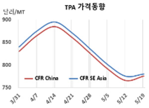 PTA(Purified Terephthalic Acid)는 반등에 성공했다. PTA 시세는 5월19일 CFR China가 톤당 775달러로 10달러, CFR SE Asia는 780달러로 5달러 상승했다. CFR India는 805달러로 10달러 올랐다. 표, 그래프: <TPA 가격동향> <화학저널 2023/05/25> |