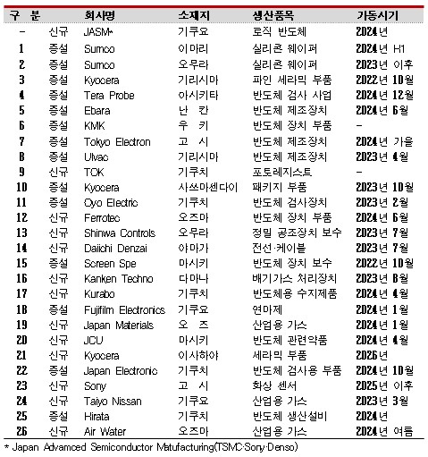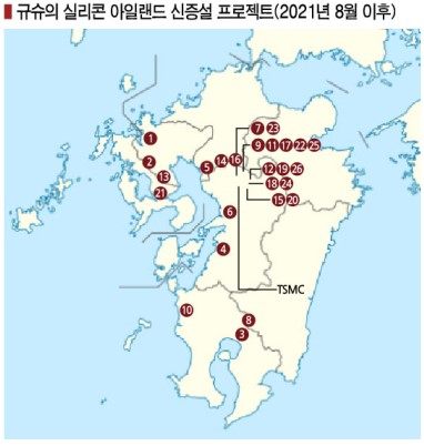 일본이 규슈(Kyushu) 지역을 중심으로 반도체산업 육성에 박차를 가하고 있다. 표, 그래프: <규수의 실리콘 아일랜드 신증설 프로젝트(2021년 8월 이후)> <화학저널 2023년 5월 29일> |