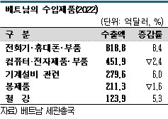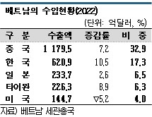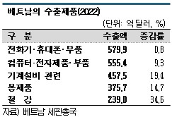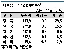 베트남 세관 총국이 발표한 2022년 수출 총액은 3713억달러로 전년대비 10.5% 증가해 2자릿수 성장을 유지했고, 수입 총액은 3589억달러