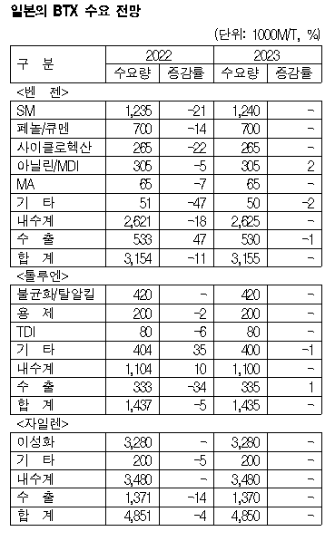 일본은 2022년 BTX(벤젠‧톨루엔‧자일렌) 수요가 감소한 것으로 나타났다. 표, 그래프: <일본의 BTX 수요 전망> <화학저널 2023/05/31> |