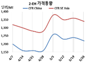 옥소알코올(Oxo-Alcohol)은 하락했다. 2-EH 시세는 5월26일 CFR China가 톤당 1220달러, CFR SE Asia도 1340달러로 각각 20달러 하락했다. 표, 그래프: <2-EH 가격동향> <화학저널 2023/06/02> |