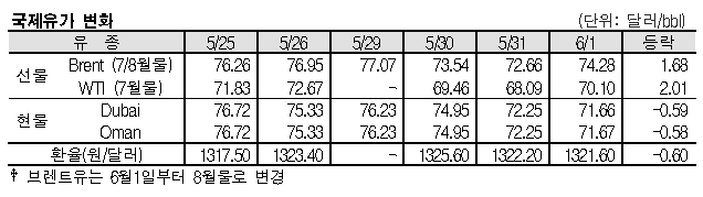 6월1일 국제유가는 미국 연방정부 부채한도 합의안의 하원 통과 영향으로 상승했다. 6월1일 국제유가는 미국 연방정부 부채한도 합의안의 하원 통과 영향으로 상승했다. 표, 그래프: <국제유가 변화> <화학저널 2023/06/02> |