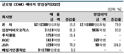세계 최대의 CDMO 메이저인 스위스 론자(Lonza)는 2022년 매출액이 6억2300만S프랑(약 8조6700억원)으로 전년대비 15.0%, 영업이익은 1
