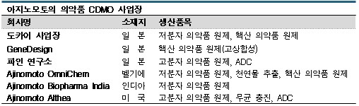 아지노모토의 의약품 CDMO 사업은 저분자, 핵산 의약품(중분자), 대표적인 바이오 의약품인 항체 의약품(고분자) 등으로 다양한 편이다.