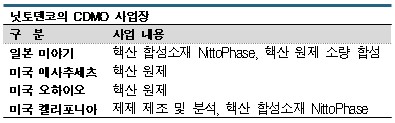 닛토덴코는 제약기업과 벤처기업으로부터 CDMO를 수주받아 후기 임상 기준으로 글로벌 시장의 60%를 점유하고 있으며 기존 생산기지가 소재한 일본‧미국에 이어 연구개발이 활발히 진행되고 있는 유럽에 신규 생산기지를 건설하는 방안을 검토하고 있다.
