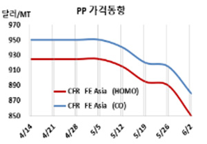 아시아 PP 시세는 5월31일 CFR FE Asia 기준 라피아(Raffia) 및 인젝션(Injection) 그레이드가 톤당 850달러로 40달러, IPP Film 및 BOPP는 865달러로 35달러, 블록 코폴리머(Block Copolymer)는 880달러로 35달러 폭락했다. 라피아 및 인젝션은 2022년 11월2일 895달러를 형성한 이후 반년만에 900달러 밑으로 떨어졌다.