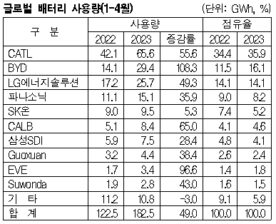 국내 배터리 3사가 중국에 계속 밀리고 있다. 표, 그래프: <글로벌 배터리 사용량(1-4월)> <화학저널 2023/06/05> |