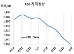 ABS(Acrylonitrile Butadiene Styrene)는 추락하고 있다. ABS 시세는 5월31일 CFR China가 톤당 1255달러로 30달러 급락했고 CFR SE Asia는 1280달러로 40달러 폭락했다. CFR S Asia는 1330달러로 30달러 급락했다. 유럽은 FD NWE 톤당 1800유로로 변동이 없었다. 표, 그래프: <ABS 가격동향> <화학저널 2023/06/07> |