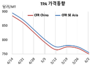 PTA(Purified Terephthalic Acid)는 다시 하락했다. PTA 시세는 6월2일 CFR China가 톤당 750달러, CFR SE Asia는 755달러로 각각 20달러 하락했다. CFR India도 785달러로 15달러 떨어졌다. 표, 그래프: <TPA 가격동향> <화학저널 2023/06/08> |