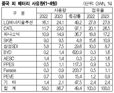 LG에너지솔루션(대표 권영수)이 중국 외 시장에서 CATL로부터 추격당하고 있다. 표, 그래프: <중국 외 배터리 사용량(1-4월)> <화학저널 2023/06/08> |