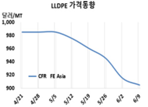 LLDPE(Linear Low-Density Polyethylene)는 900달러가 위태로워지고 있다. LLDPE 시세는 6월7일 CFR FE Asia가 톤당 905달러로 10달러, CFR SE Asia는 955달러로 10달러 하락했다. CFR S Asia는 965달러로 20달러 떨어졌다. 특히, 유럽은 FD NWE 1050유로로 80유로 폭락했다. 표, 그래프: <LLDPE 가격동향> <화학저널 2023/06/12> |