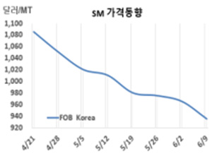 SM(Styrene Monomer)은 하락세를 장기화하고 있다. SM 시세는 6월9일 FOB Korea가 톤당 935달러로 30달러, CFR SE Asia도 945달러로 20달러 하락했다. 중화권도 CFR China와 CFR Taiwan가 935달러로 30달러 떨어졌다. CFR India는 940달러로 25달러 하락했다. 표, 그래프: <SM 가격동향> <화학저널 2023/06/14> |