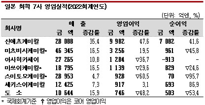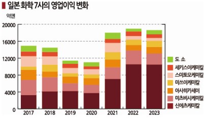 일본 화학 메이저 7사 중 4사는 자동차·반도체 소재 사업 호조에 따라 2023회계연도(2023년 4월-2024년 3월) 영업이익이 증가할 것으로 기