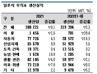 일본은 한때 마스크·가운 수입을 대폭 확대했으나 세계적인 서플라이체인 혼란으로 수입이 어려워짐에 따라 자체 생산량을 늘린 바 있다. 하지만, 2021년 마스크‧가운 부족 사태가 해소됐고 부직포 시장에 타격을 준 것으로 나타났다.