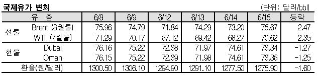 6월15일 국제유가는 중국 정제 투입량 증가로 폭등했다. 국제유가는 중국 정제 투입량 증가 영향으로 폭등했다. 표, 그래프: <국제유가 변화> <화학저널 2023/06/16> |