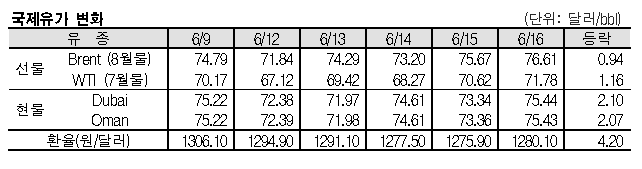 6월16일 국제유가는 중국 수요 증가 기대를 타고 상승했다. 국제유가는 중국 수요 증가에 대한 기대가 확대됨에 따라 상승했다. 표, 그래프: <국제유가 변화> <화학저널 2023/06/19> |