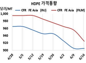 HDPE(High-Density Polyethylene)는 보합세를 형성했다. HDPE 시세는 6월14일 인젝션(Injection) 그레이드 기준 CFR FE Asia가 톤당 905달러, CFR SE Asia는 945달러로 변동이 없었다. 블로우몰딩(Blow-Molding)은 FEA가 910달러로 변동이 없었으나 SEA는 950달러로 10달러 하락했다. 필름(Film)은 FEA가 925달러, SEA는 970달러로 보합세를 형성했고, 얀(Yarn)도 FEA가 915달러, SEA는 960달러로 변동이 없었다. 표, 그래프: <HDPE 가격동향> <화학저널 2023/06/19> |
