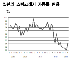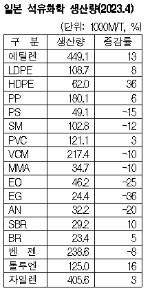 일본이 에틸렌(Ethylene) 가동률을 올리고 있다. 표, 그래프: <일본의 스팀크래커 가동률 변화>, <일본 석유화학 생산량(2023.4)> <화학저널 2023/06/19> |