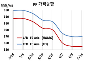 원료 프로필렌(Propylene)은 6월13일 CFR China 톤당 715달러로 45달러, FOB Korea 705달러로 40달러 하락했고, PP(라피아)-프로필렌 스프레드는 톤당 125달러로 늘었으나 여전히 손익분기점 150달러를 밑돌고 있는 것으로 분석된다.