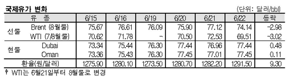 6월22일 국제유가는 영국 기준금리 인상 영향으로 폭락했다. 국제유가는 영국의 기준금리 인상 폭이 예상보다 큰 폭이었던 영향으로 폭등했다. 표, 그래프: <국제유가 변화> <화학저널 2023/06/23> |