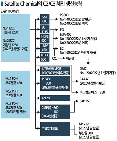Satellite Chemical은 2020년 No.1 ECC와 PE, EO 플랜트를 건설했고 No.2 ECC 및 유도제품 플랜트까지 포함한 설비투자에 총 3500억위안(약 7조2000억원)을 투입한 것으로 알려졌다.