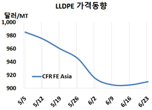 LLDPE(Linear Low-Density Polyethylene)는 동북아만 소폭 상승했다. LLDPE 시세는 6월21일 CFR FE Asia가 톤당 910달러로 5달러 상승했으나 CFR SE Asia는 945달러로 변동이 없었다. CFR S Asia도 945달러로 보합세를 형성했다. 유럽은 6월23일 FD NWE 1000유로로 10유로 하락했다. 표, 그래프: <LLDPE 가격동향> <화학저널 2023/06/26> |