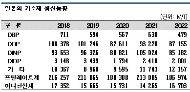 일본은 2021년 가소제 생산량 및 출하량이 코로나19 팬데믹(Pandemic: 세계적 대유행) 이전 수준을 되찾은 바 있으나 2022년 다시 감소했다.