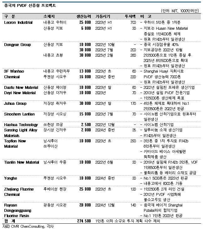 자회사 Huaan New Material도 2022년 중반 PVDF 5000톤 라인을 가동했고 Huaan New Material 독자적으로 PVDF 6000톤, R142b 1만1000톤 건설을 준비하고 있다.