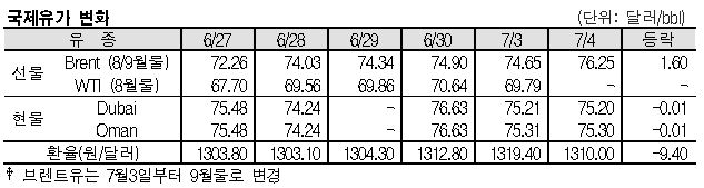 한국석유공사에 따르면, 런던원유거래소(ICE)의 브렌트유(Brent) 선물유가는 배럴당 76.25달러로 전일대비 1.60달러 급등했고 뉴욕상업거래소(NYMEX)의 WTI(서부텍사스 경질유)는 미국 Independence Day 휴일로 거래되지 않았다.