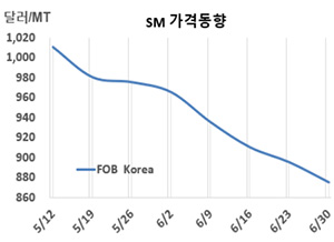 SM(Styrene Monomer)은 추락을 계속하고 있다. SM 시세는 6월30일 FOB Korea가 톤당 875달러로 20달러, CFR SE Asia도 885달러로 20달러 하락했다. 중화권도 CFR China는 880달러, CFR India는 875달러로 각각 20달러 떨어졌다. 표, 그래프: <SM 가격동향> <화학저널 2023/07/05> |