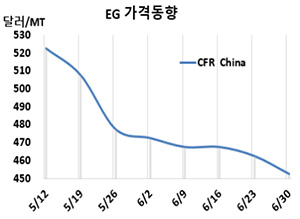 MEG(Monoethylene Glycol)는 또 하락했다. MEG 시세는 6월30일 CFR China가 톤당 453달러로 10달러 하락했고 CFR SE Asia는 458달러로 15달러 떨어졌다. 표, 그래프: <EG 가격동향> <화학저널 2023/07/06> |
