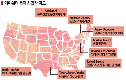 일본이 북미 산업가스 시장 진출에 속도를 내고 있다. 표, 그래프: <에어워터 북미 사업장 지도> <화학저널 2023년 7월 10일> |