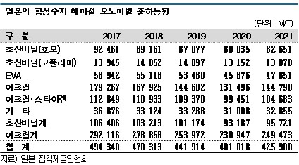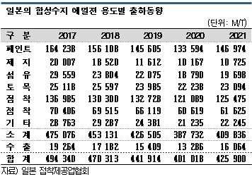일본 출하량은 전년대비 5.7% 증가해 40만9836톤으로 회복됐고 수출은 20.9% 급증해 총 42만5900톤으로 6.2% 늘었다. 페인트는 10%대 급증했다. 초산비닐(Vinyl Acetate)계는 10만톤대가 무너졌으나 9만5721톤으로 2.7% 증가했고, 아크릴계는 24만9473톤으로 8.0% 증가해 회복세를 나타냈다.