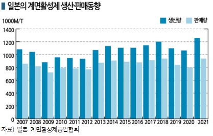 일본 계면활성제공업협회에 따르면, 2021년 계면활성제 생산량은 14.3% 급증해 사상 최고인 125만9011톤을 기록했고 판매량도 14.4% 늘었다. 식품 등 일상생활 관련 분야는 안정적이나 자동차 생산량이 증가하지 않고 컴퓨터 관련 분야가 부진한 것으로 알려졌다.