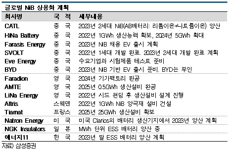 중국은 CATL와 HaiNa Bettry 외에도 Farasis Energy가 2023년 NiB 베이스 전기자동차를 출시할 예정이며, SVOLT는 2022년 1세대 배터리 개발에 이어 2023년 2세대 개발을 완료할 계획이다. Eve Energy는 수요처와 시험제품 테스트를 준비하고 있고, 비야디(BYD)도 2023년 NiB를 전기자동차에 탑재할 것으로 알려졌으나 비야디는 부인하고 있다.