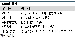 유진투자증권에 따르면, NiB 생산원가는 kWh당 77달러로 전기자동차 1대당 5500달러 이상 절약할 수 있으며 CATL이 생산능력을 확대하고 경제성을 높이면 40달러까지 낮아져 대당 9200달러가 절감될 것으로 예측된다. IRA 보조금은 대당 7500달러 수준이다.