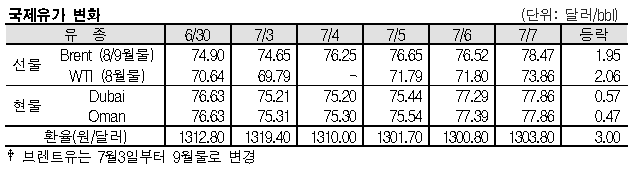 7월7일 국제유가는 공급 우려가 확대된 영향으로 급등했다. 국제유가는 글로벌 원유 공급을 둘러싼 우려가 확대됨에 따라 급등했다. 표, 그래프: <국제유가 변화> <화학저널 2023/07/10> |