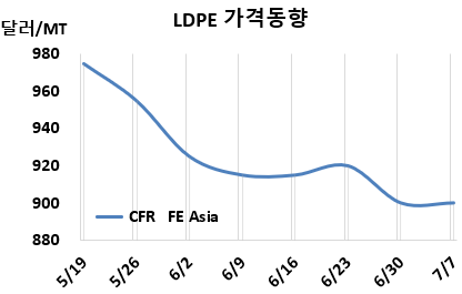 LDPE(Low-Density Polyethylene)는 변동이 없었다. LDPE 시세는 7월5일 CFR FE Asia가 톤당 900달러, CFR SE Asia도 910달러로 변동이 없었다. CFR India 역시 945달러로 4주 연속 보합세를 형성했다. 표, 그래프: <LDPE 가격동향> <화학저널 2023/07/10> |
