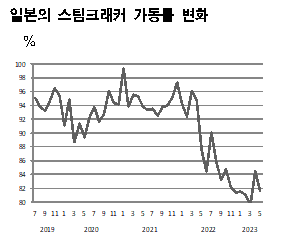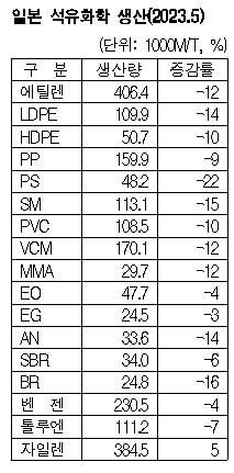 일본이 에틸렌(Ethylene) 가동률을 또 낮추었다. 표, 그래프: <일본의 스팀크래커 가동률 변화>, <일본 석유화학 생산(2023.5)> <화학저널 2023/07/17> |