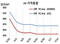 PP(Polypropylene)는 인디아만 상승했다. 아시아 PP 시세는 7월12일 CFR FE Asia 기준 라피아(Raffia) 및 인젝션(Injection) 그레이드가 톤당 835달러, IPP Film 및 BOPP는 850달러, 블록 코폴리머(Block Copolymer)는 865달러로 변동이 없었다. CFR SE Asia도 라피아 및 인젝션 865달러, IPP Film 및 BOPP 875달러, 블록 코폴리머 890달러로 보합세를 형성했다. 표, 그래프: <PP 가격동향> <화학저널 2023/07/18> |
