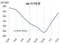 SM(Styrene Monomer)은 급등세를 이어갔다. SM 시세는 7월14일 FOB Korea가 톤당 955달러로 40달러, CFR SE Asia도 975달러로 40달러 급등했다. CFR China는 960달러로 45달러 급등했고, CFR India는 995달러로 60달러 폭등했다. 표, 그래프: <SM 가격동향> <화학저널 2023/07/19> |