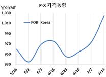 P-X(Para-Xylene)는 상승세가 가팔랐다. P-X 시세는 7월14일 FOB Korea가 톤당 1025달러로 50달러, CFR SE Asia는 1045달러로 55달러 급등했다. CFR Taiwan도 1040달러로 55달러 급등했다. 표, 그래프: <P-X 가격동향> <화학저널 2023/07/20> |