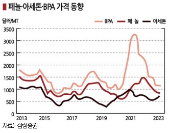 삼성증권에 따르면, 글로벌 페놀 신증설은 2023년 165만톤으로 전년대비 11.8%, 2024년 171만톤으로 10.9% 확대될 예정이나 수요 증가는 2023년 21만톤, 2024년 33만톤에 그쳐 2025년까지 공급 부담이 이어질 것으로 예상된다.