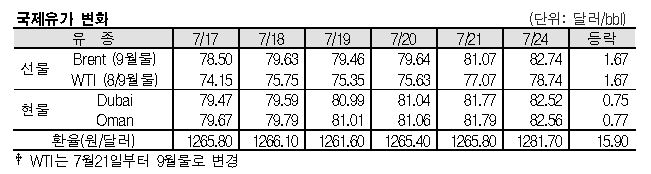 7월24일 국제유가는 공급 부족 우려, 중국 경기부양책 기대 등으로 급등했다. 국제유가는 공급 부족 우려에 따라 급등했다. 표, 그래프: <국제유가 변화> <화학저널 2023/07/25> |